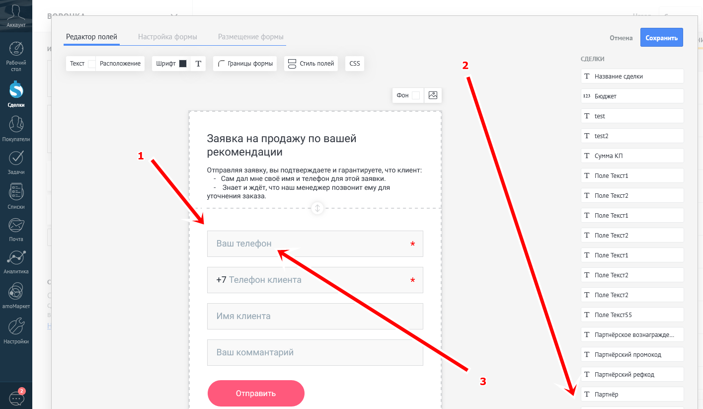 Также вам нужно будет переименовать поле "Телефон партнёра" в "Ваш телефон" и выбрать поля обязательные для заполнения(3).