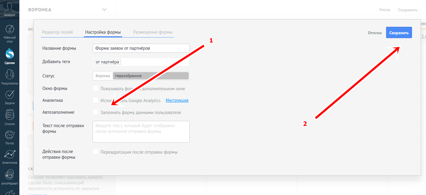 Далее перейдите на вкладку «Настройка формы». Снимете галочку «Заполнять форму данными пользователя»(1) и нажмите кнопку «Сохранить»(2)