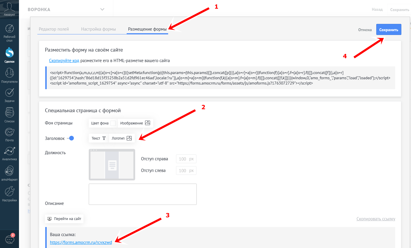 5 Далее перейдите на вкладку «Размещение формы»(1). Тут вы можете изменить фон на котором размещается форма и её заголовок(2). Скопируйте ссылку на созданную форму(3).