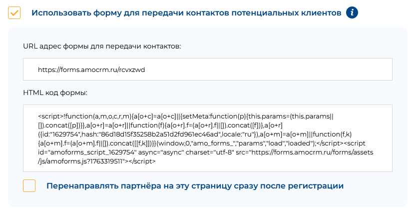 Далее добавьте URL адрес формы на 3-ем шаге настроек условий сотрудничества. После этого в личных кабинетах партнёров появится пункт меню - «Зарегистрировать клиента». Если вы добавите HTML-код формы - она будет доступна внутри личного кабинета.