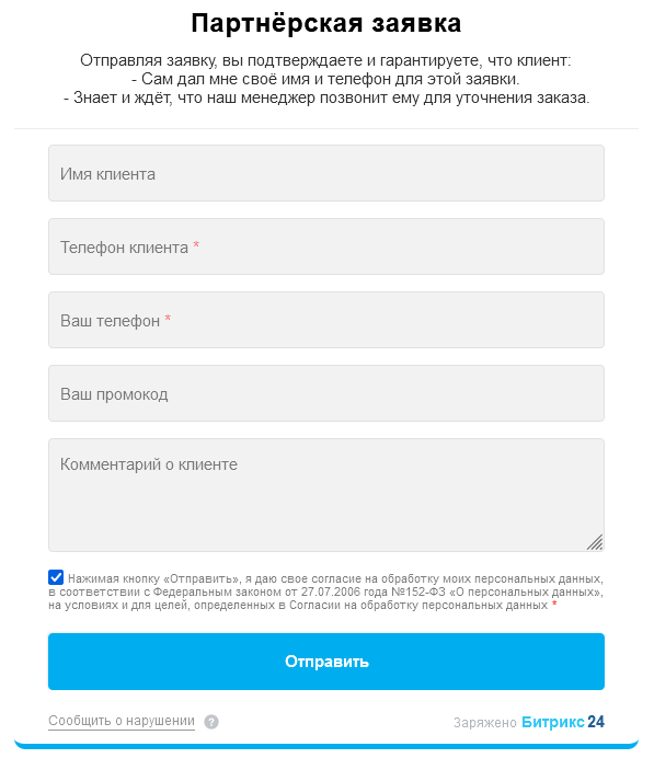 Для таких случаев вы можете создать специальную форму. Партнёр должен будет рассказать потенциальному клиенту о преимуществах вашего продукта или услуги и предупредить что с ним свяжутся от вашей компании, после этого отправить вам контакты этого клиента через такую форму.