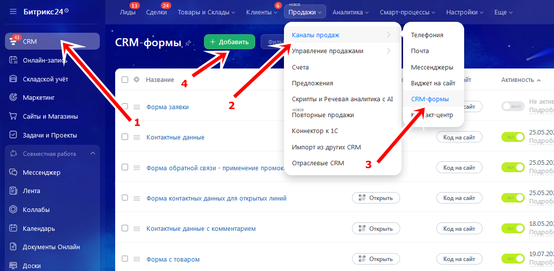 CRM → Продажи → Каналы продаж(2) → CRM-формы(3) и нажмите кнопку Добавить(4):