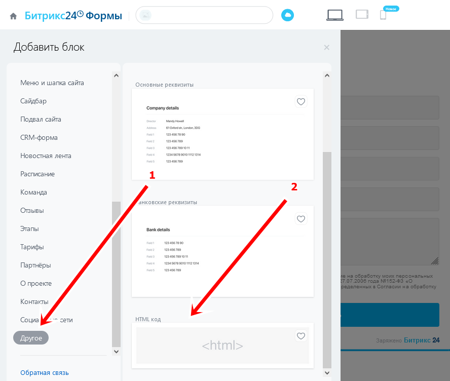 10 В левом меню выберите Другое и блок HTML код
